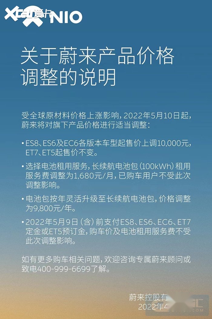 一起,蔚来还宣告旗下ES6、ES8、EC6将在5月10日迎来价格调整,各版别均将上调1万元。