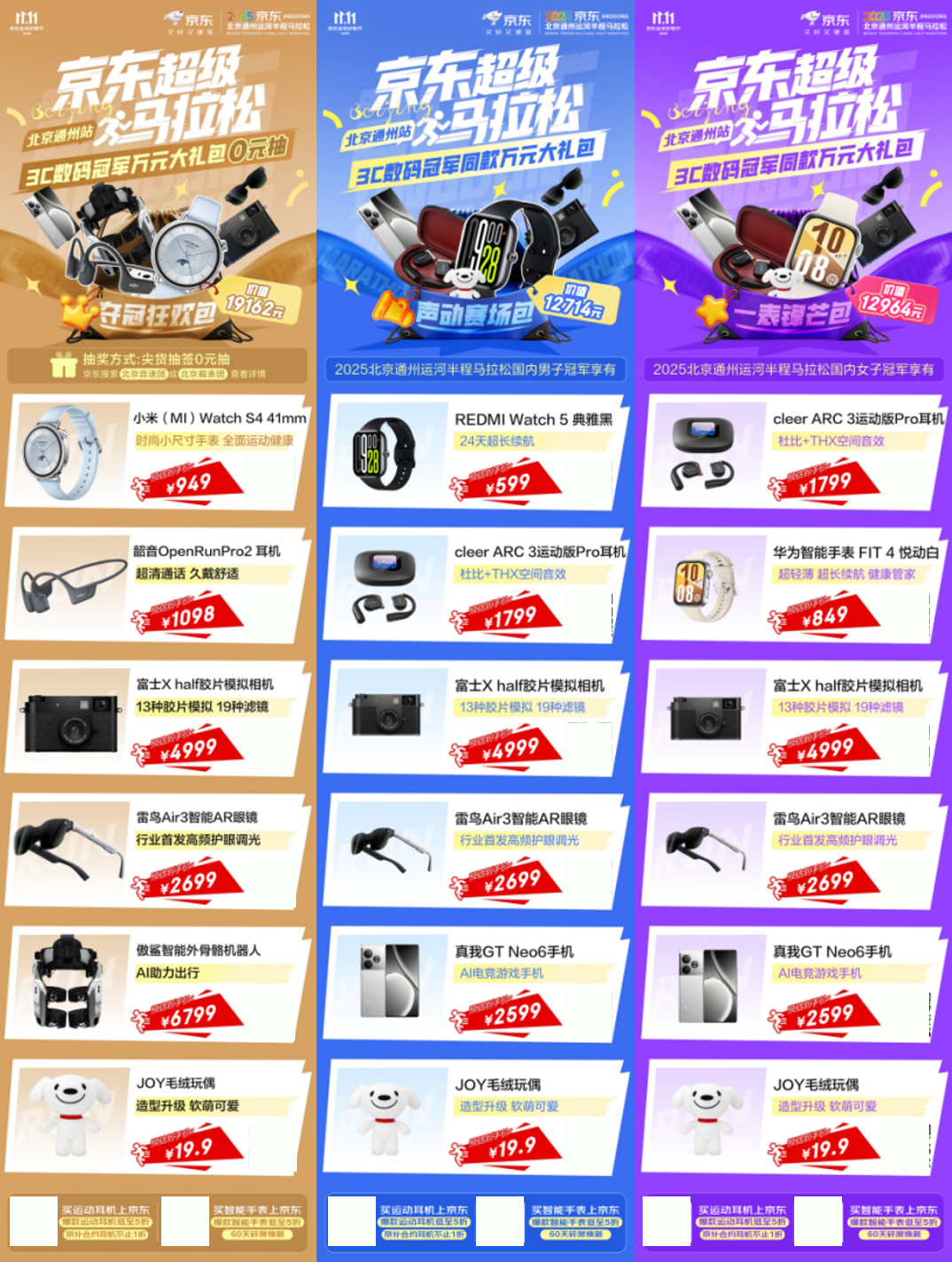 本日起,跑友可前往2025京东北京通州运河半程马拉松展位,收取定量好礼,现场体会多款智能运动配备。正值京东11.11大促,运动耳机、智能手表等中心运动品类同步敞开专属优惠爆款运动耳机低至5折,京补合约耳机不止1折;爆款智能手表低至5折,并享60天碎屏焕新服务。翻开京东APP,查找 “北京音速团” 或 “北京戴表团”,即可一站式选购专业运动配备,畅享限时优惠与专属福利。此外,查找 “京补合约” 还可叠加京补券,以更优价格下手韶音运动耳机,更有时机参加1折抢购大牌耳机活动,包括 韶音、cleer、声阔、科大讯飞 等人气品牌,好货不定量,惊喜不断!